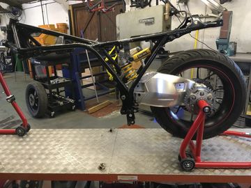 Full R6 suspension set up installed removing the horizontal shock under the engine. This allows for much better ground clearance as the pipes can be fitted into the space where the shock was.