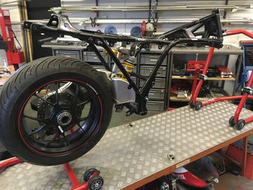 To modify the Honda Swing Arm, and fabricate and install the required suspension mounts and frame bracing into the LC frame to fit the Honda's suspension set up.